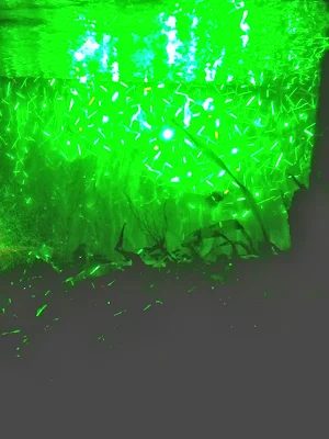 This is not edit photo with invert colour.  I take a pictured in the night when I went from my friend house. Its my friend aquarium with laser lighting reflection. Domination colour is green. There was some red colour lightning reflection it look disappear in this photo. Its good art creation and beautiful. My friend who made it so satisfied when he finishing this art work. In front of me there was other art glasses creation made by my friend. I cant said thats aquarium or terarium because there was two function. A little fish inside water with small aquarium and there  is small terrarium with plant inside glass box. I think this is new art idea creation. Its about creative art decoration.   I never seen this art creation before.